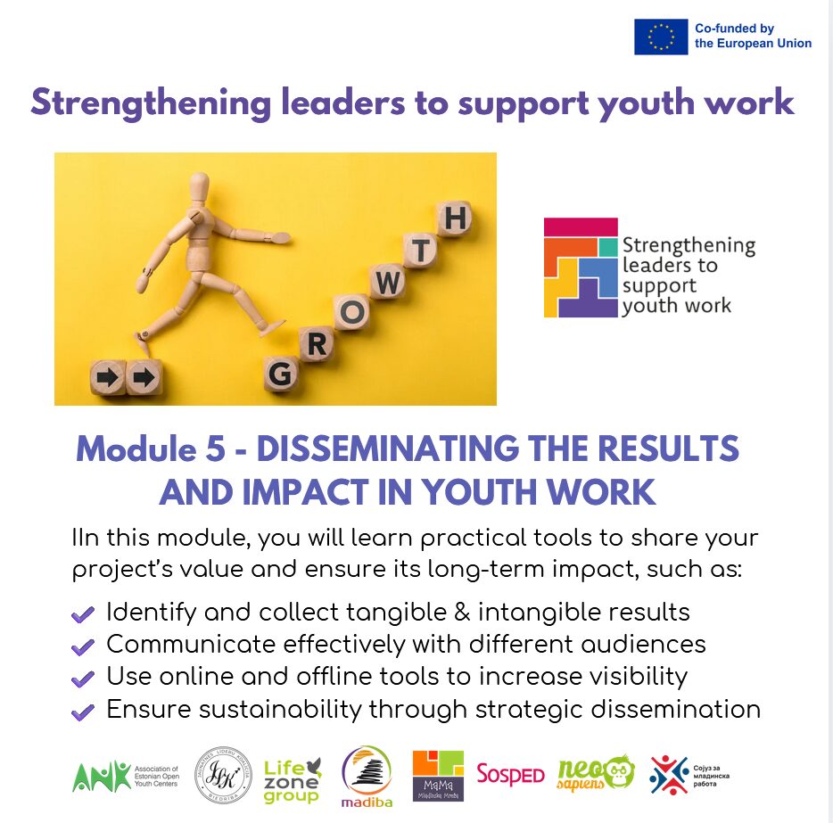 The aim of this module is to equip youth work leaders with a strategic mindset and practical tools to effectively and sustainably disseminate the results of their projects—enhancing visibility, engaging stakeholders, and ensuring long-term impact across local, national, and European levels.