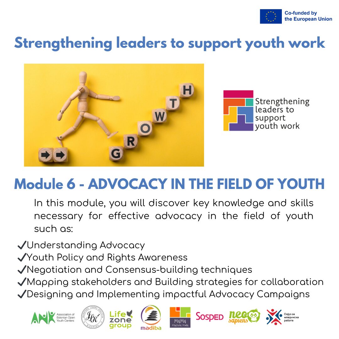 Module 6 ”Advocacy in the field of youth” is designed to equip the leaders - managers and directors in youth work (hereafter - the leaders) with the knowledge and skills necessary for effective advocacy in the field of youth, focusing on empowering young people and addressing the challenges the young people face.